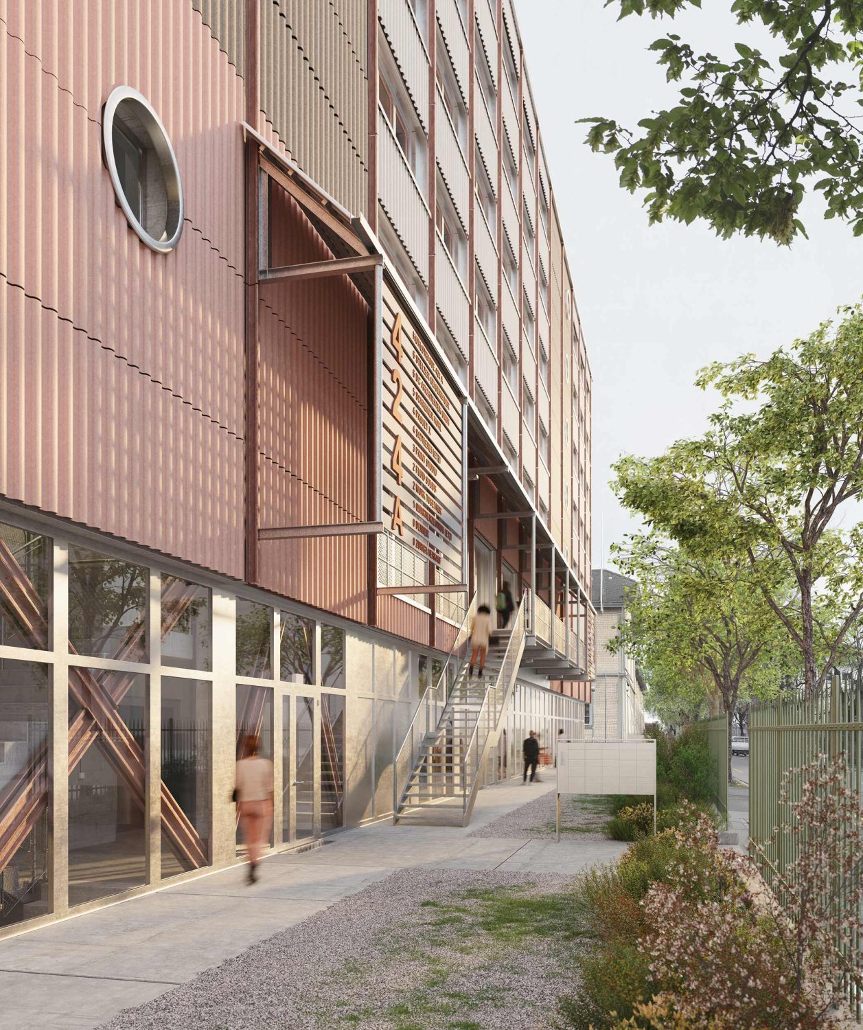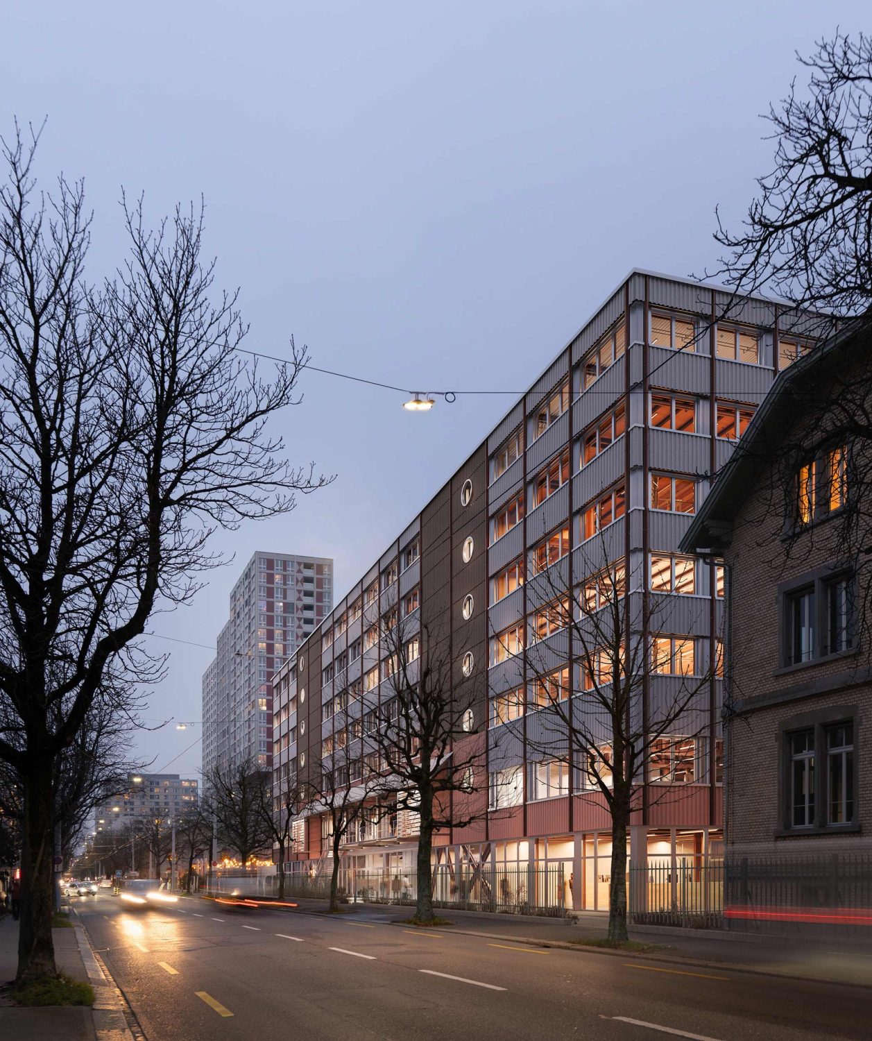 Ein abgestuftes zehngeschossiges Verwaltungsgebäude wird im Norden um ein freistehendes, siebengeschossiges Gebäude ergänzt. Das Ensemble besteht aus skulpturalen, massiven Volumen. Von Nahe vermitteln die hell verputzten Fassaden mit wiederkehrenden Fensteröffnungen und vertikalen Lisenen eine feine Massstäblichkeit mit einem ausgeprägten Licht- und Schattenspiel. Eine Auskragung über die gesamte Gebäudelänge an der Langsägestrasse schützt die Eingänge der Mitarbeitenden und die Zufahrt zur Tiefgarage. Richtung Norden, zum zentralen Aussenraum, überdacht ein 18 Meter weit auskragendes Volumen Aufenthaltszonen mit Sitzgelegenheiten und weitere Zugänge. In dem abgestuften Baukörper bilden ein Hof im zweiten Obergeschoss sowie Terrassen im vierten und achten Geschoss begrünte Erholungsorte.