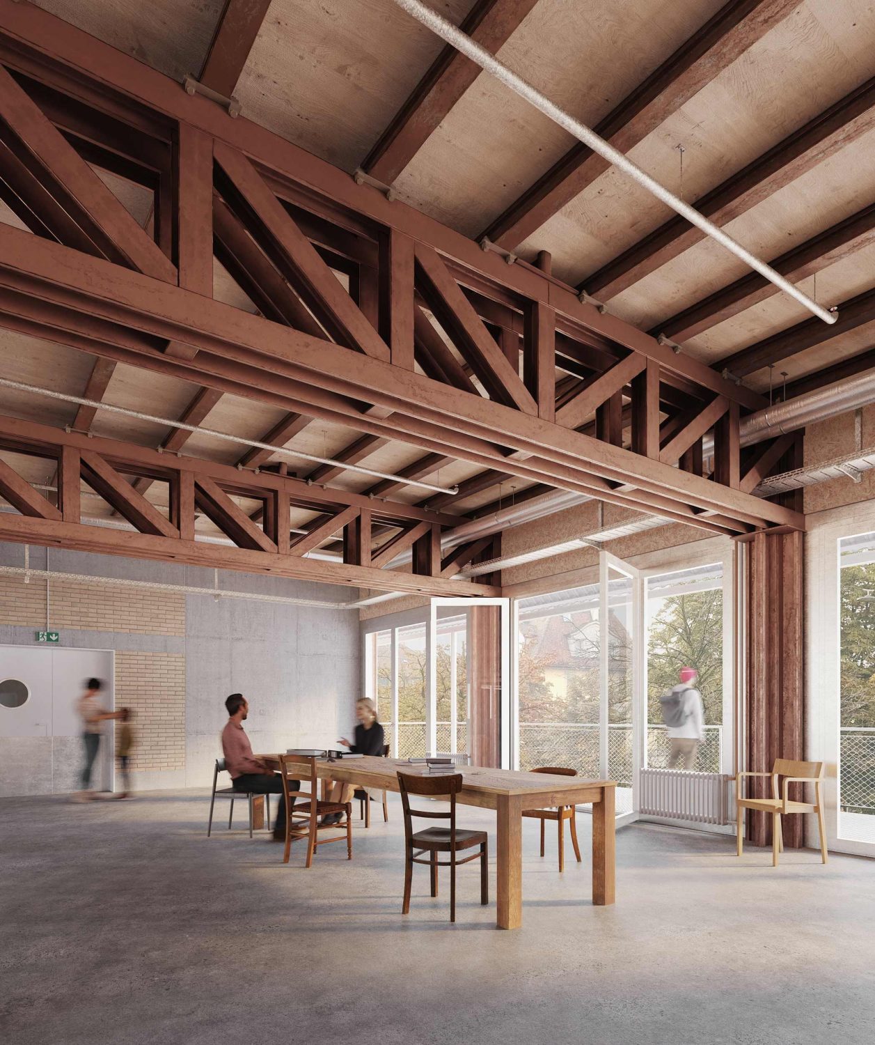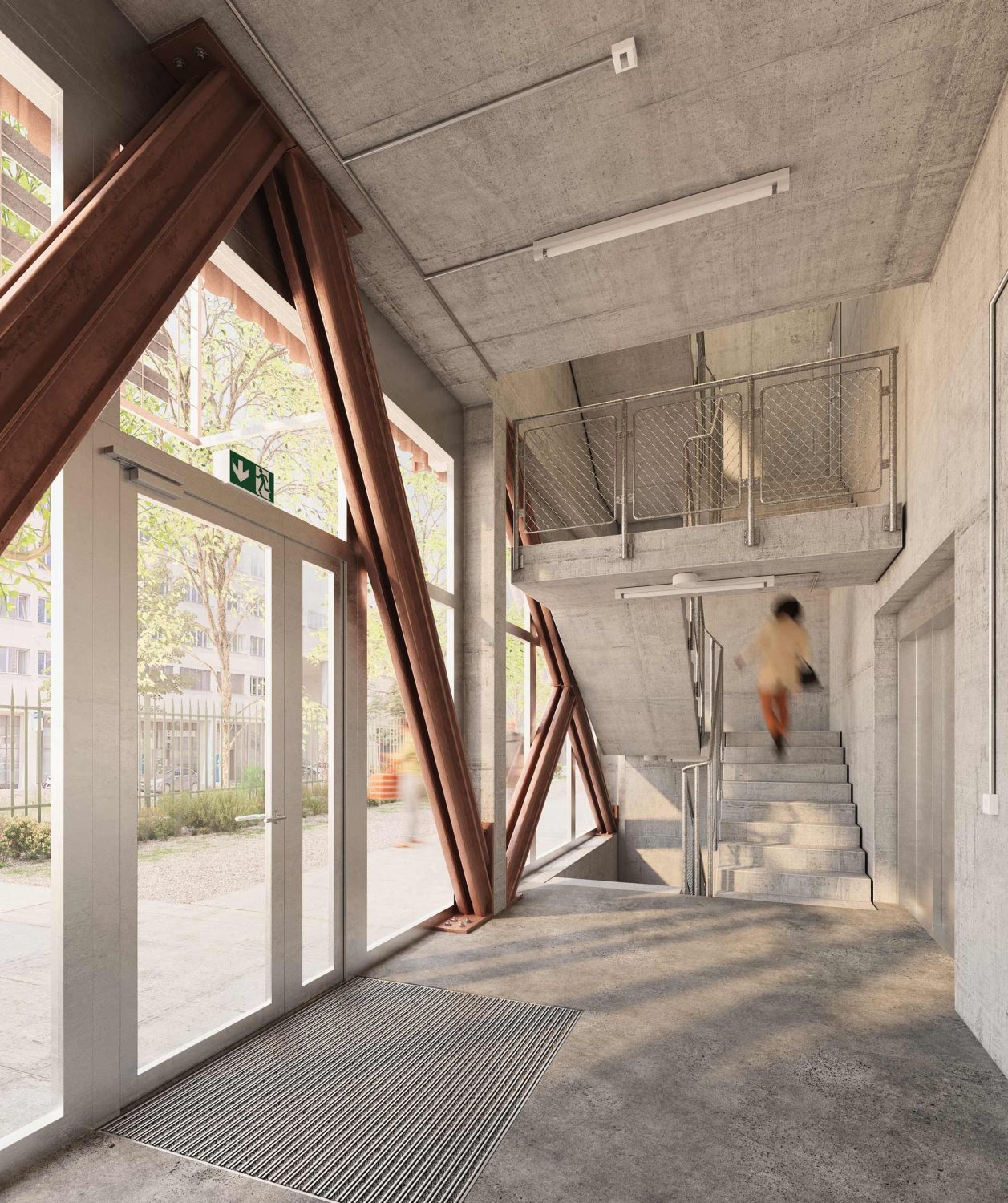 Der Neubau versteht sich als Stadtbaustein mit strukturell klar gegliederten Grundrissen, die den Mitarbeitenden und Kunden der vier Geschäftsbereiche eine einfache Orientierung bieten. Der Haupteingang am östlichen Zugangsplatz führt in eine grosszügige Eingangshalle mit Empfang, Warte- und Beratungszonen. Das anschliessende zentrale Foyer ist mit vier runden Oberlichtern natürlich belichtet und steht über eine Galerie in Sichtbeziehung mit den Sitzungszimmern im ersten Obergeschoss. Die nach Süden orientieren Seminarräume lassen sich mit mobilen Trennwänden unterteilen oder für Grossveranstaltungen zum Foyer hin erweitern.