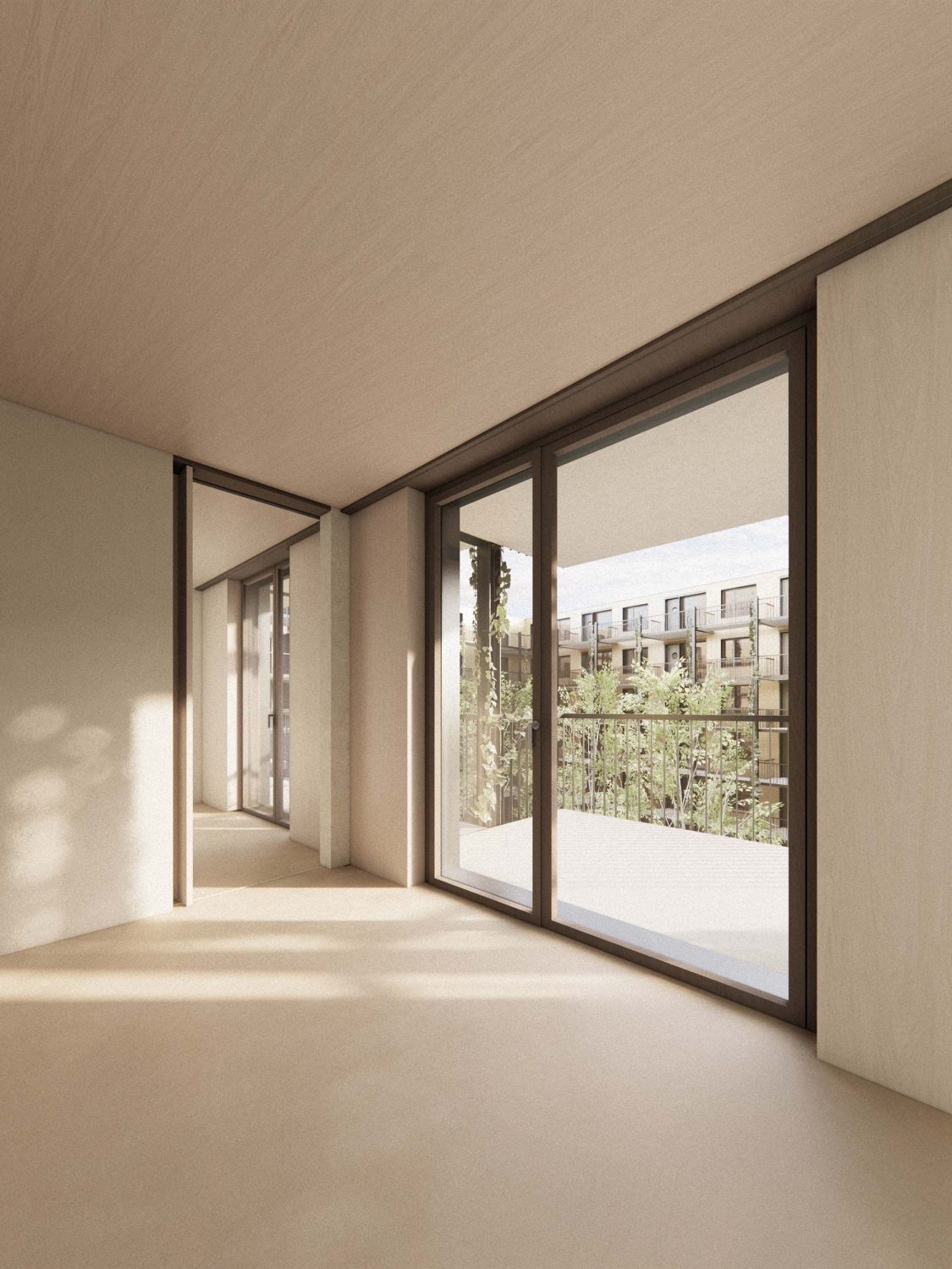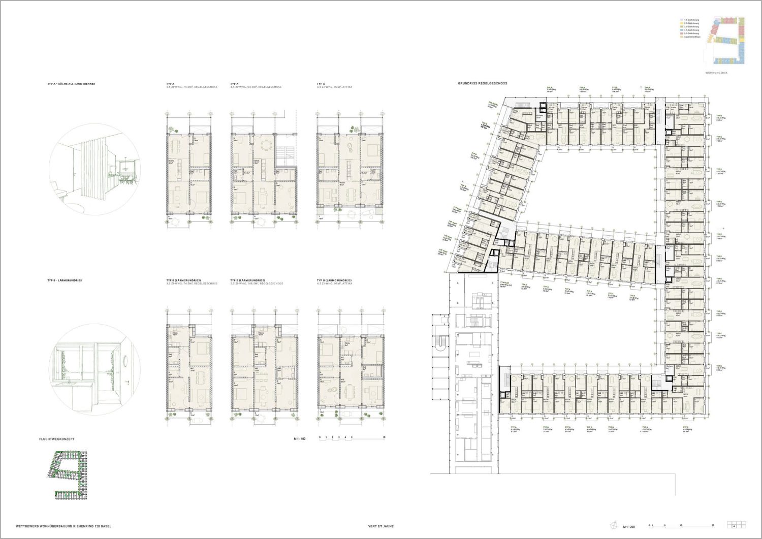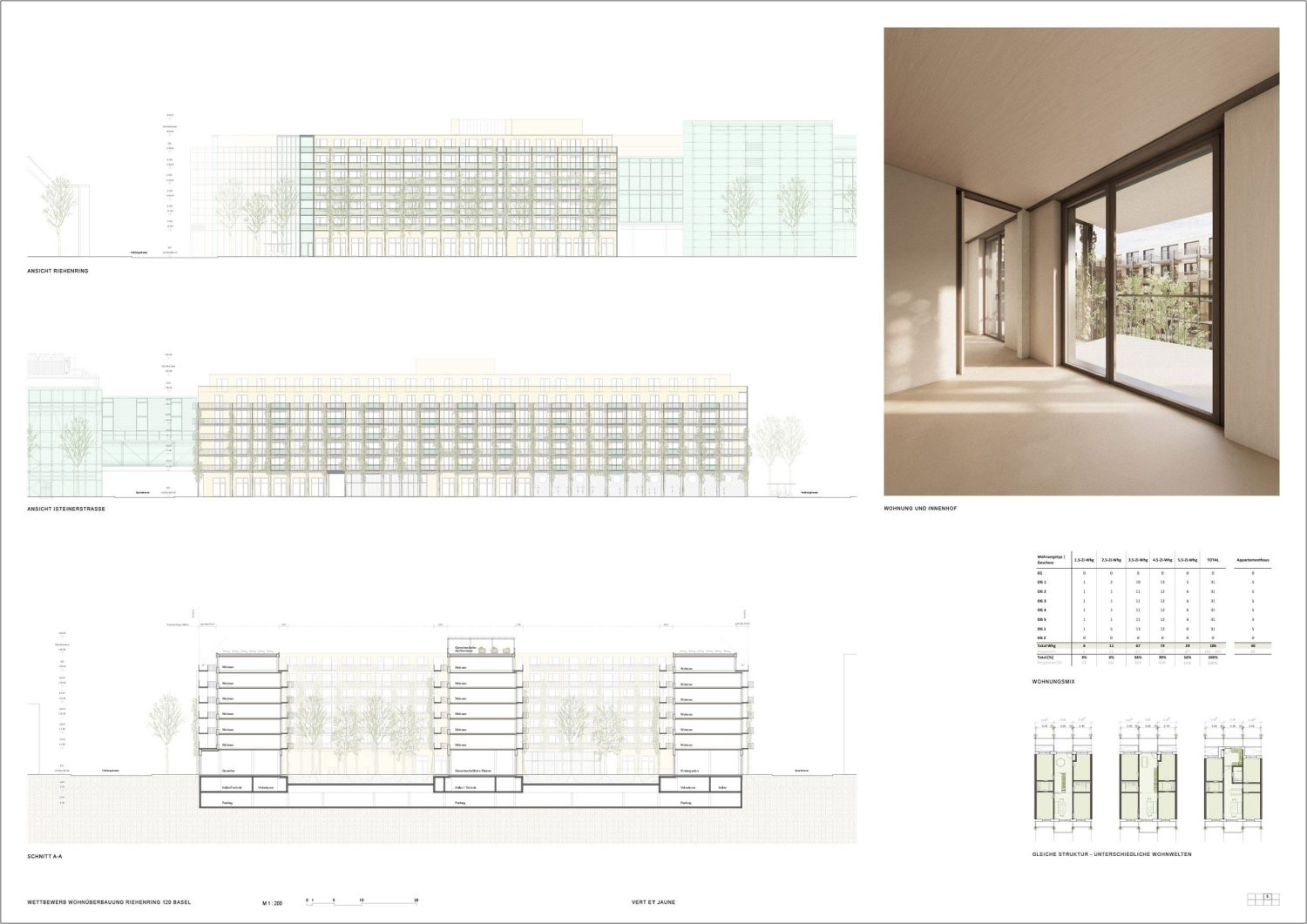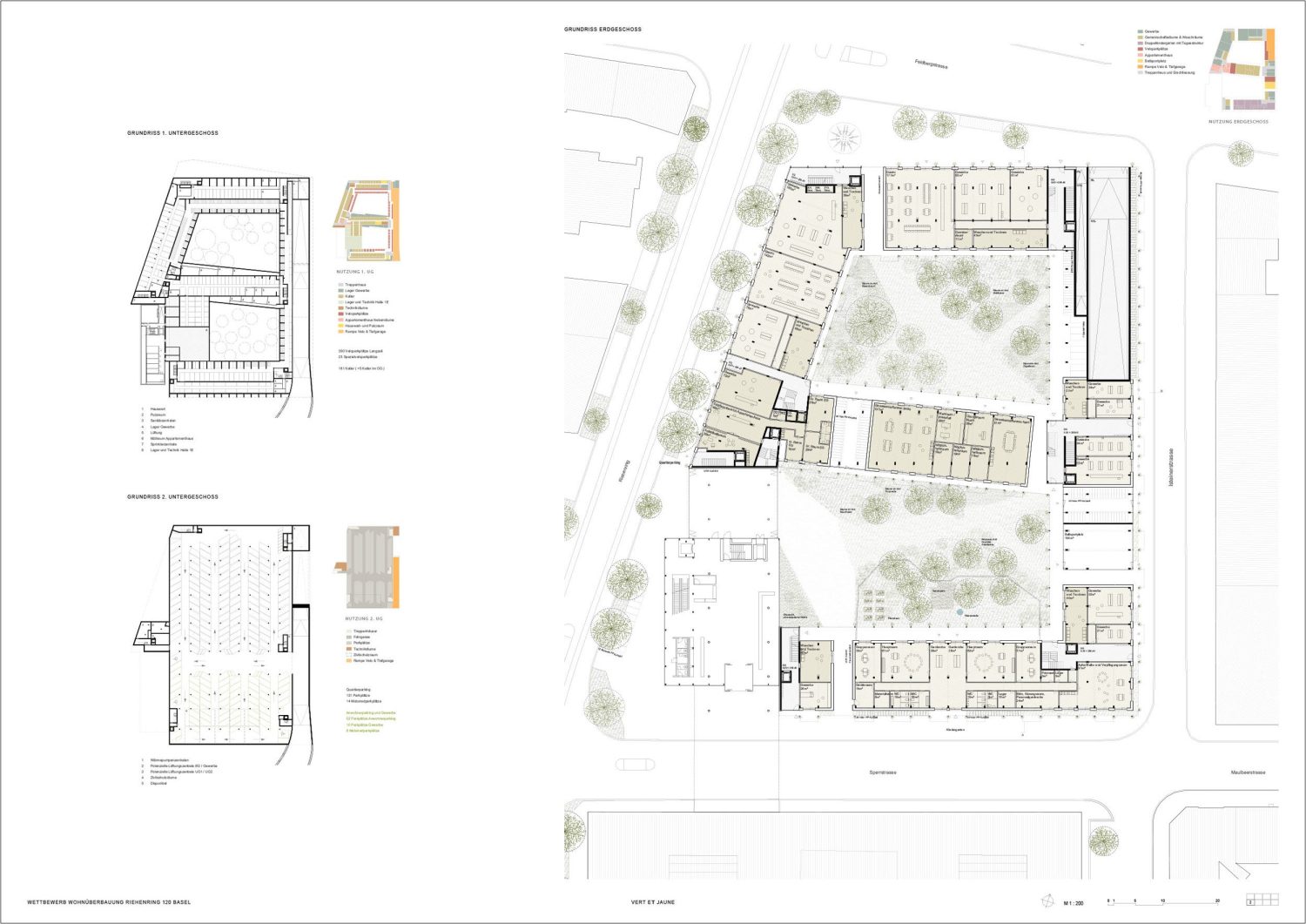 Programme The existing school building by Roland Leu (1992) can be preserved. A new wooden school building complements the existing school complex and offers two atriums and covered playgrounds. The new triple gymnasium with a fourth public gymnasium and an all-weather area on the roof, is located on the existing civil defence facility. The outdoor areas will only be moderately adjusted. Newly planted trees will shade the break areas, and climbing plants will grow up the gym facades. The non-accessible roof areas will be equipped with photovoltaic systems with extensive greenery.